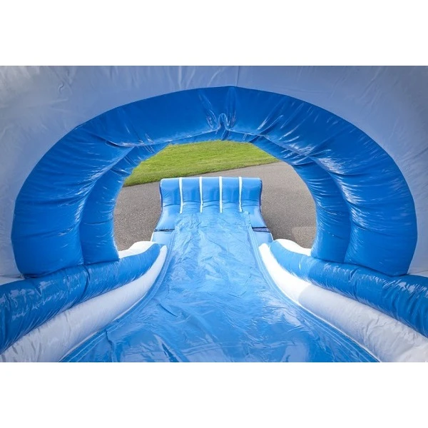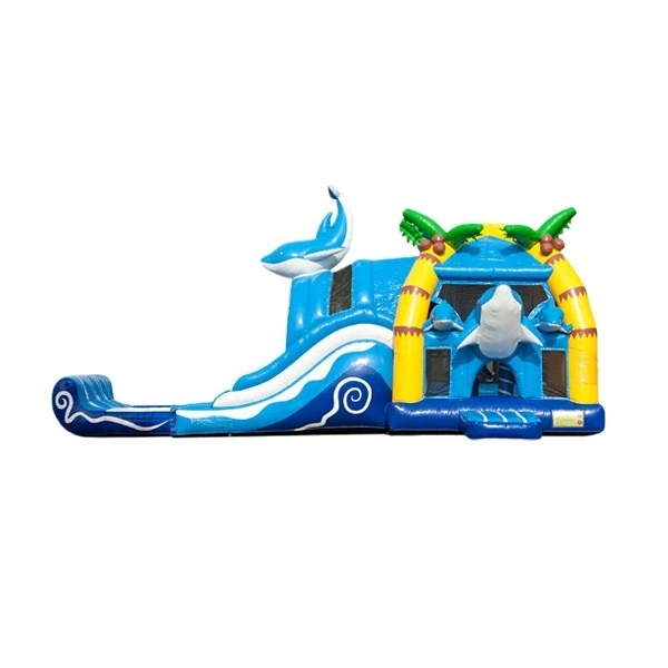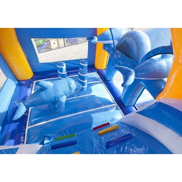 Het springkussen dolfijn is zeer uitgebreid met een dubbele glijbaan, obstakels waar kinderen op, over en omheen kunnen springen