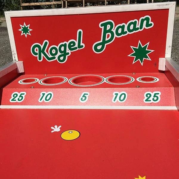 Rol de houten kogel over de baan zodat deze op het uiteinde in de puntengaten rolt. De baan is aan het uiteinde voorzien van een verhoging als extra spelelement.