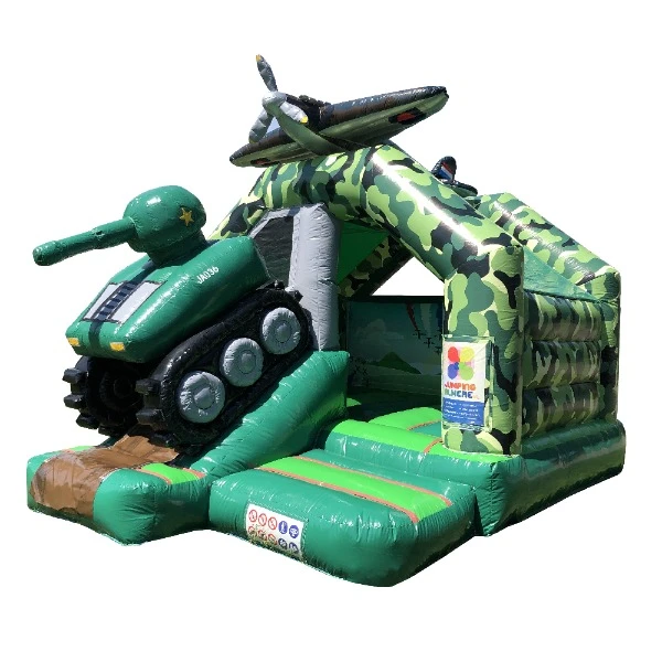 Spring tussen de straaljagers en glijd als een echte soldaat onder de tank door, in dit gave leger springkussen! Als je omhoog kijkt zie je de spitfire die langs vliegt. Raak het kussen niet uit het oog, voor dat je het weet ben je hem kwijt.. Hij is namelijk gecamoufleerd!